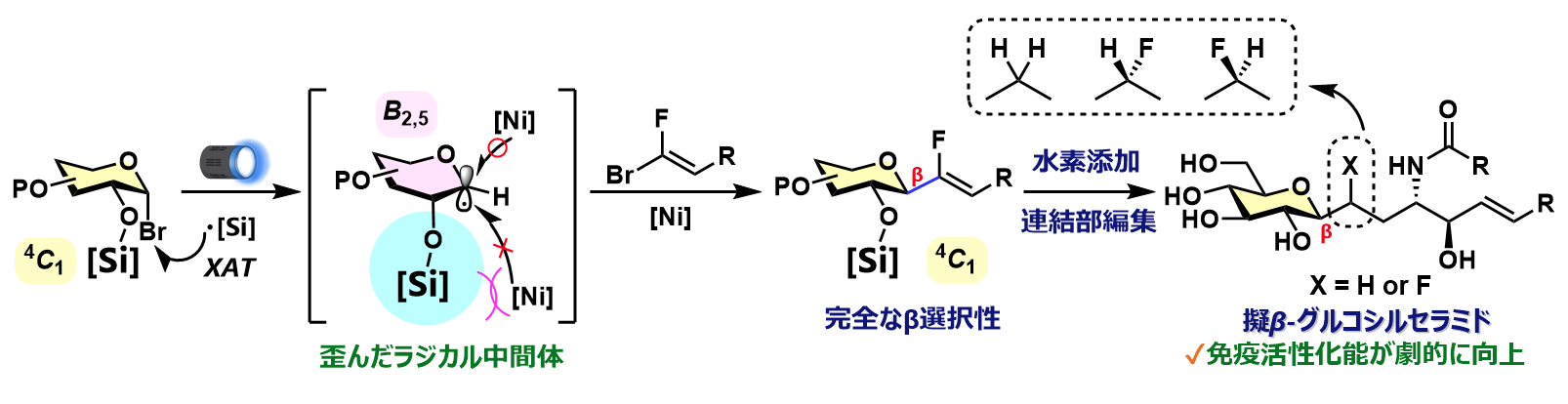 天然に存在する糖鎖・複合糖質は酸素原子(O-グリコシド結合)で連結されています。これを炭素原子(C-グリコシド結合)に変えた炭素連結型アナログは、天然型糖鎖・複合糖質の構造を模倣しつつ、糖加水分解酵素により分解されない生物機能分子として期待されています。C-グリコシド結合の構築法はいくつか報告されていますが、生物活性に大きく影響するグリコシド結合の立体化学(α/β)を制御し、生物活性分子創製に利用できる合成法は極めて限定的でした。 九州大学大学院薬学研究院の平井剛教授、寄立麻琴講師らの研究グループと、大阪大学微生物病研究所の山崎晶教授、石川絵里助教らの研究グループは、β-C-グルコシド結合のみを構築できる新手法を、光酸化還元反応とニッケル触媒による還元的カップリング反応を利用して開発し、様々な炭素連結型アナログの中間体(フルオロビニル-C-グリコシド中間体)の合成を実現しました。これを起点として、CH₂型、(R)-CHF型、(S)-CHF型の3種類の炭素連結様式をもつ擬β-グルコシルセラミド(β-GlcCer)および擬β-グルコシルコレステロール(β-GlcChol)の分岐合成に成功しました。さらに、炭素連結型擬β-GlcCerが、内在性の天然型β-GlcCer(O-グリコシド型)と比較して高い免疫活性を示すこと、さらに連結様式によって樹状細胞の成熟度が変化することを明らかにしました。これらの成果は、内在性糖脂質の機能解析研究や、免疫治療薬開発への応用が期待されます。 本研究成果は、アメリカ化学会が出版する国際誌 Journal of the American Chemical Society のオンライン版にて、2026年1月10日付けで掲載されました。 |